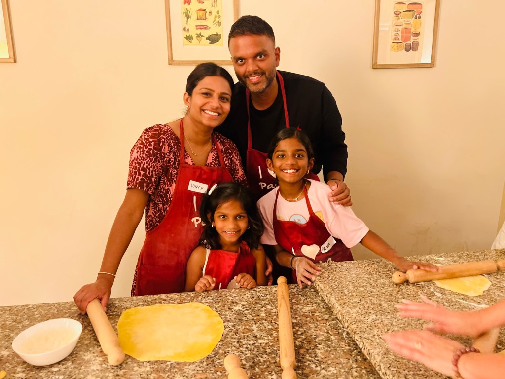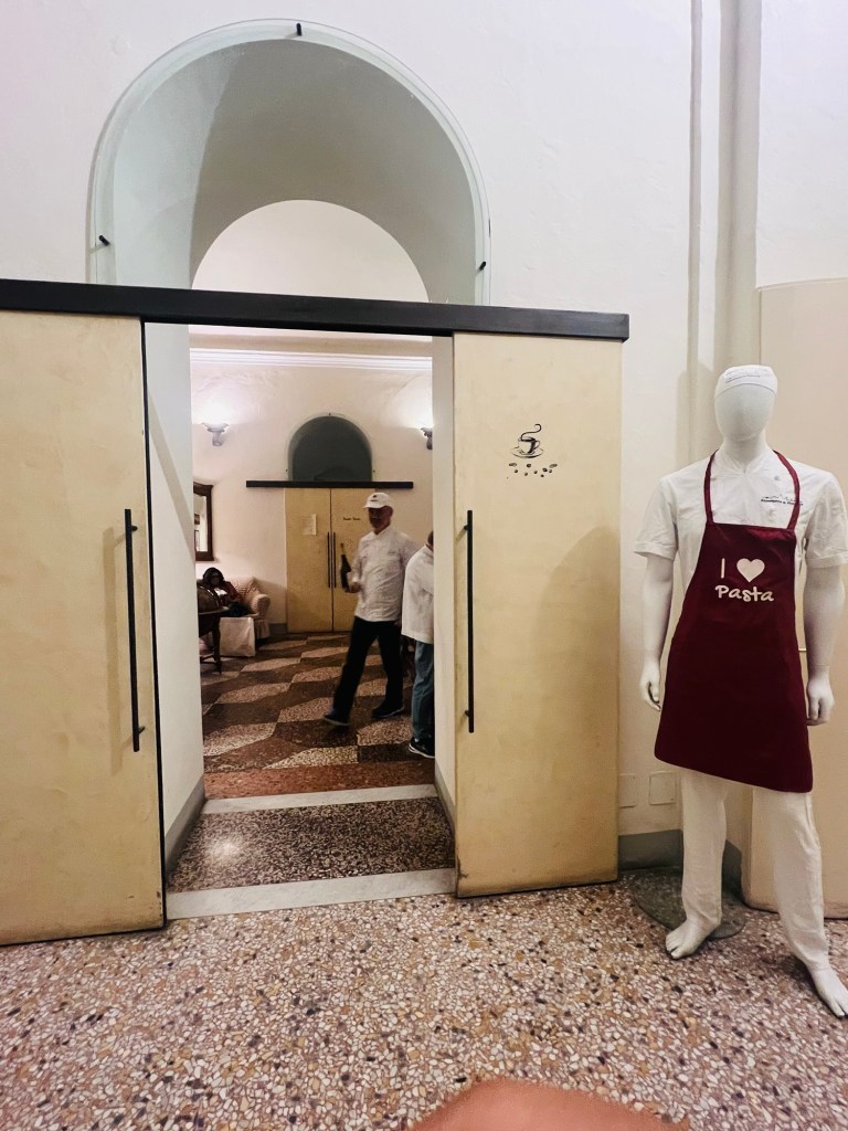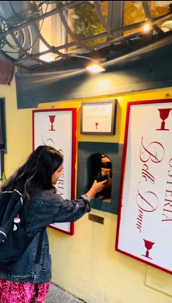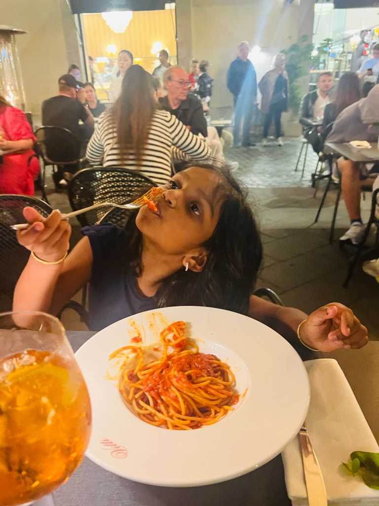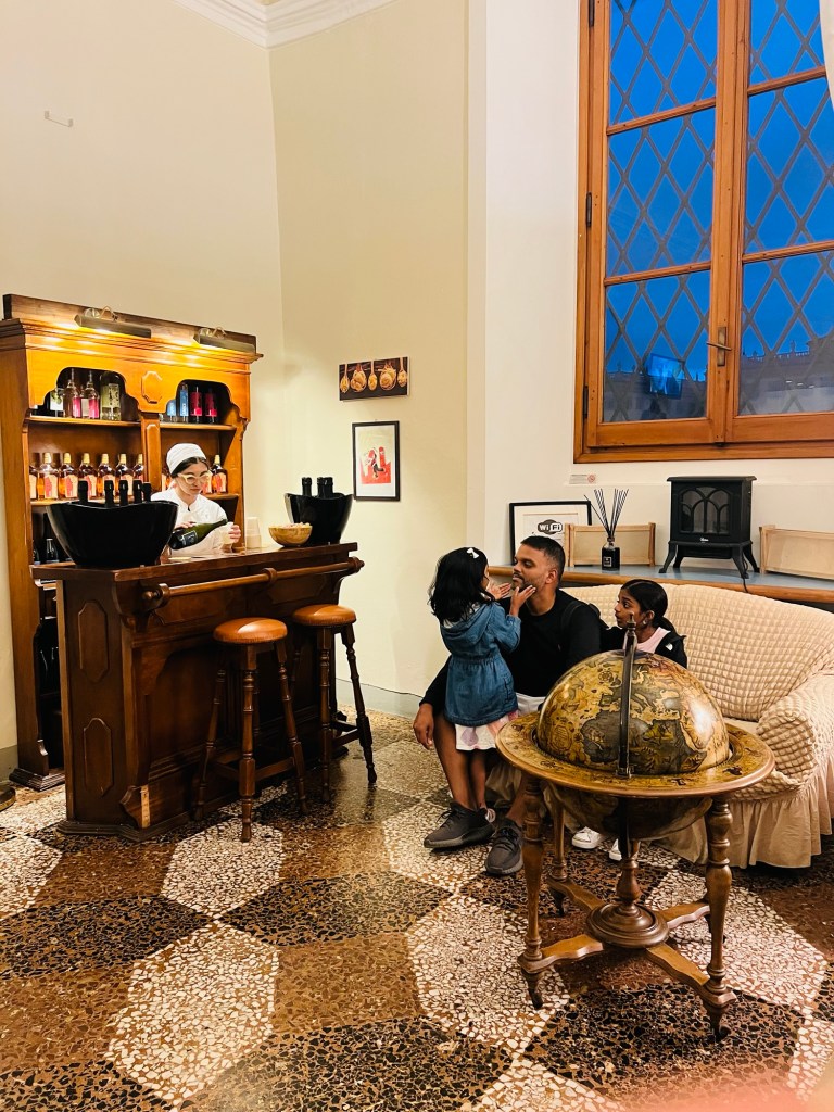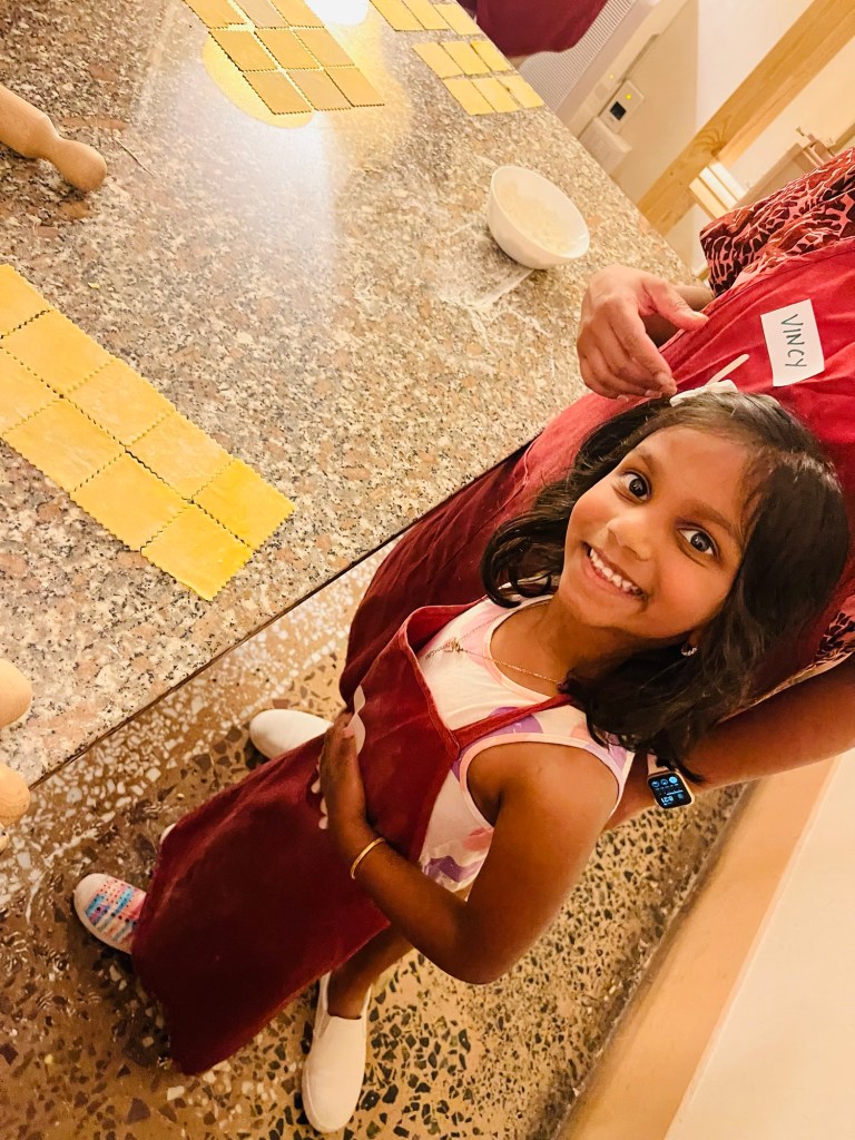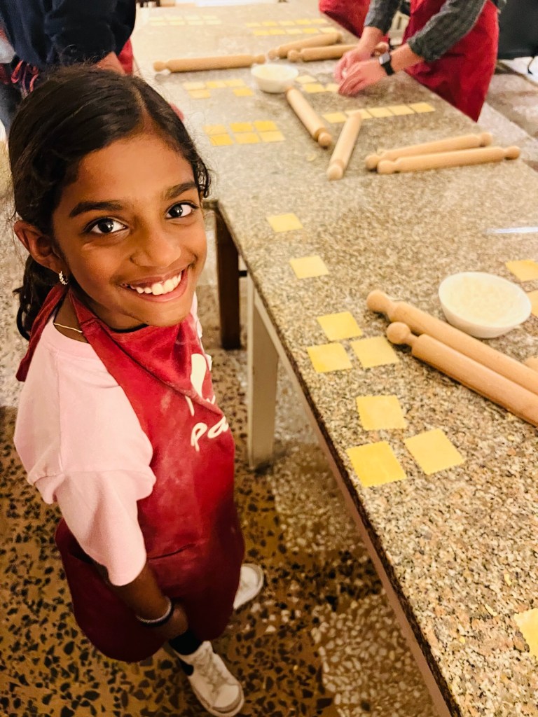 While walking around, we stumbled upon “buchetta del vino” or a wine window! So simple and yet so fun! 😆We grab lunch at a cute little restaurant nearby the wine window and noticed a large train station/warehouse across the street. We walked over after lunch and realized it was a large food hall, how fun! We head back to the hotel to get ready for our evening activity and come across the most beautiful street art! 😍We finally arrive at our evening activity: a pasta making class! As soon as Ava found out about our trip to Italy this was her first request. We did a class by Pastamania and loved it! This is us waiting for our class to begin. Here we are ready to EAT!Our wonderful instructor!Aaliyah hard at work stuffing ravioli!